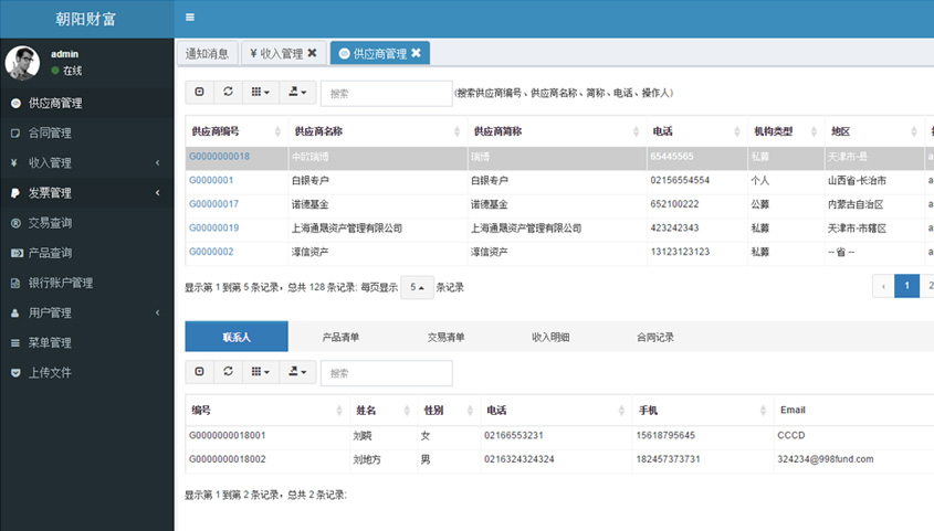 - 供應商管理: 供應商信息管理,包括交易、收入、聯(lián)系人、產品等
