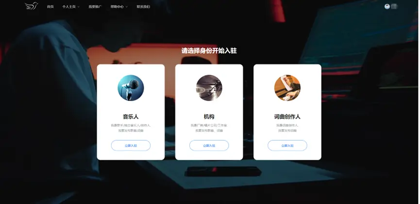 首頁:音樂人認(rèn)證、詞曲作者、已入駐音樂人、已入駐詞曲作者、熱門原創(chuàng)